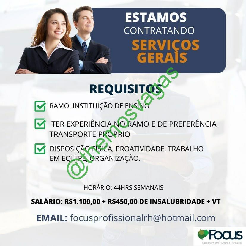 – Interessados(as) e que atendam ao perfil solicitado acima, devem enviar o currículo para o e-mail  focusprofissionalrh@hotmail.com, contendo no título/assunto “Serviço GeralTHE“.