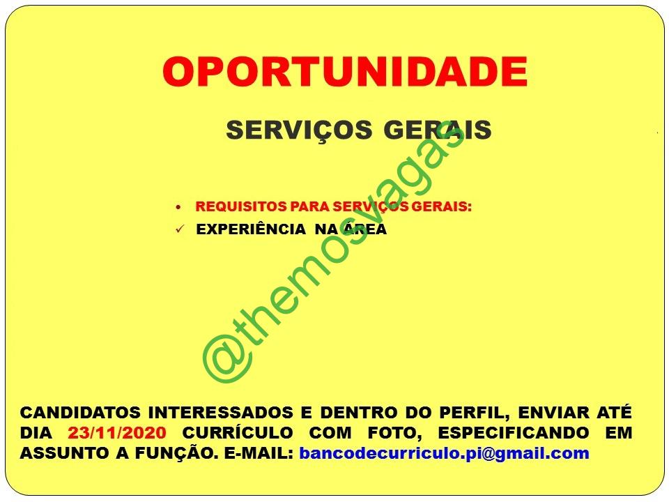 – Interessados(as) e que atendam ao perfil solicitado acima, devem enviar o currículo com foto até 23/11/2020 para o e-mail bancodecurriculo.pi@gmail.com contendo no título/assunto “Serviços Gerais – Timon
