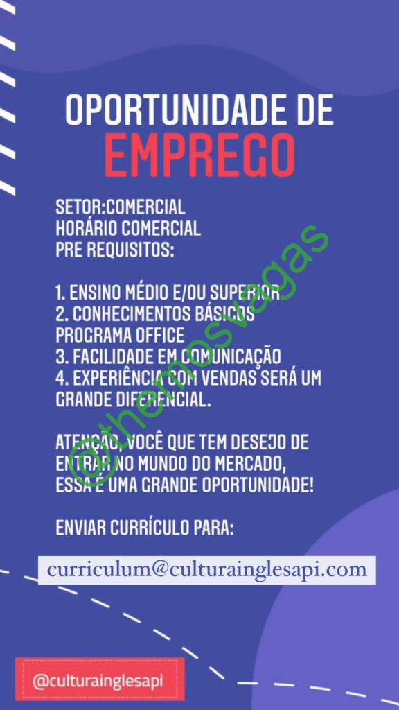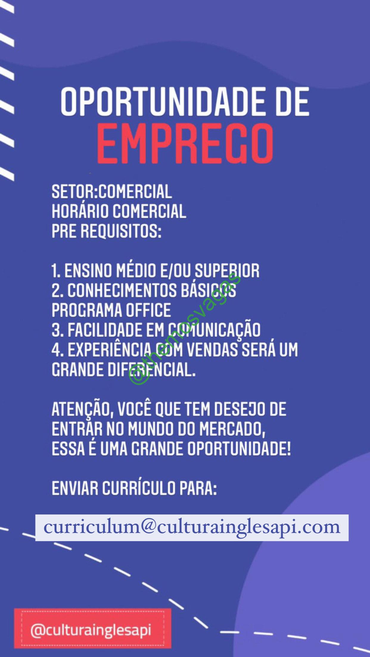 – Interessados(as) e que atendam ao perfil solicitado acima, devem enviar o currículo para o e-mail curriculum@culturainglesapi.com contendo no título/assunto “Setor Comercial THE