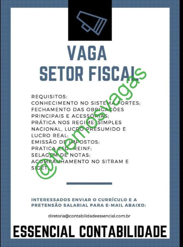 – Interessados(as) e que atendam ao perfil solicitado acima, devem enviar o currículo para o e-mail diretoria@contabilidadeessencial.com.br, contendo no título/assunto “Setor Fiscal – FOR”.