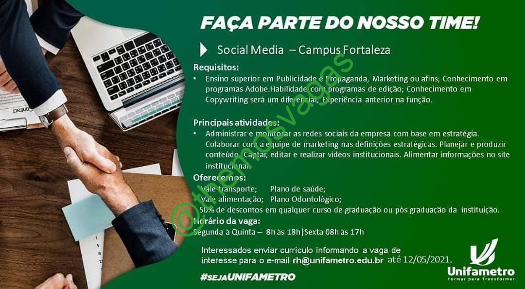 – Interessados(as) e que atendam ao perfil solicitado acima, devem enviar o currículo até 12|05|2021 para o e-mail rh@unifametro.edu.br, contendo no título/assunto “Social Media – FOR“.
