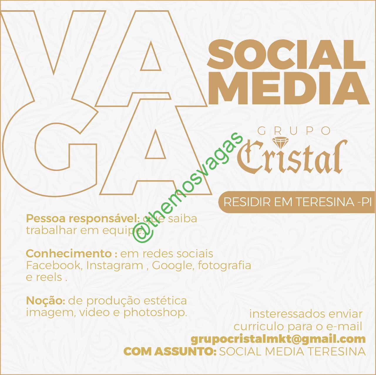 – Interessados(as) e que atendam ao perfil solicitado acima, devem enviar o currículo para o e-mail grupocristalmkt@gmail.com contendo no título/assunto “Social Media Teresina