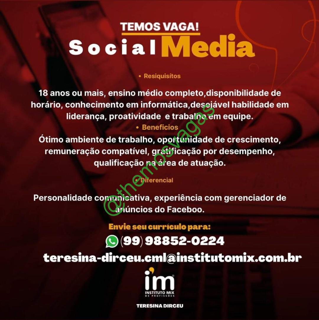 – Interessados(as) e que atendam ao perfil solicitado acima, devem enviar o currículo para o e-mail teresina-dirceu.cml@institutomix.com.br contendo no título/assunto “Social Media – THE“.
