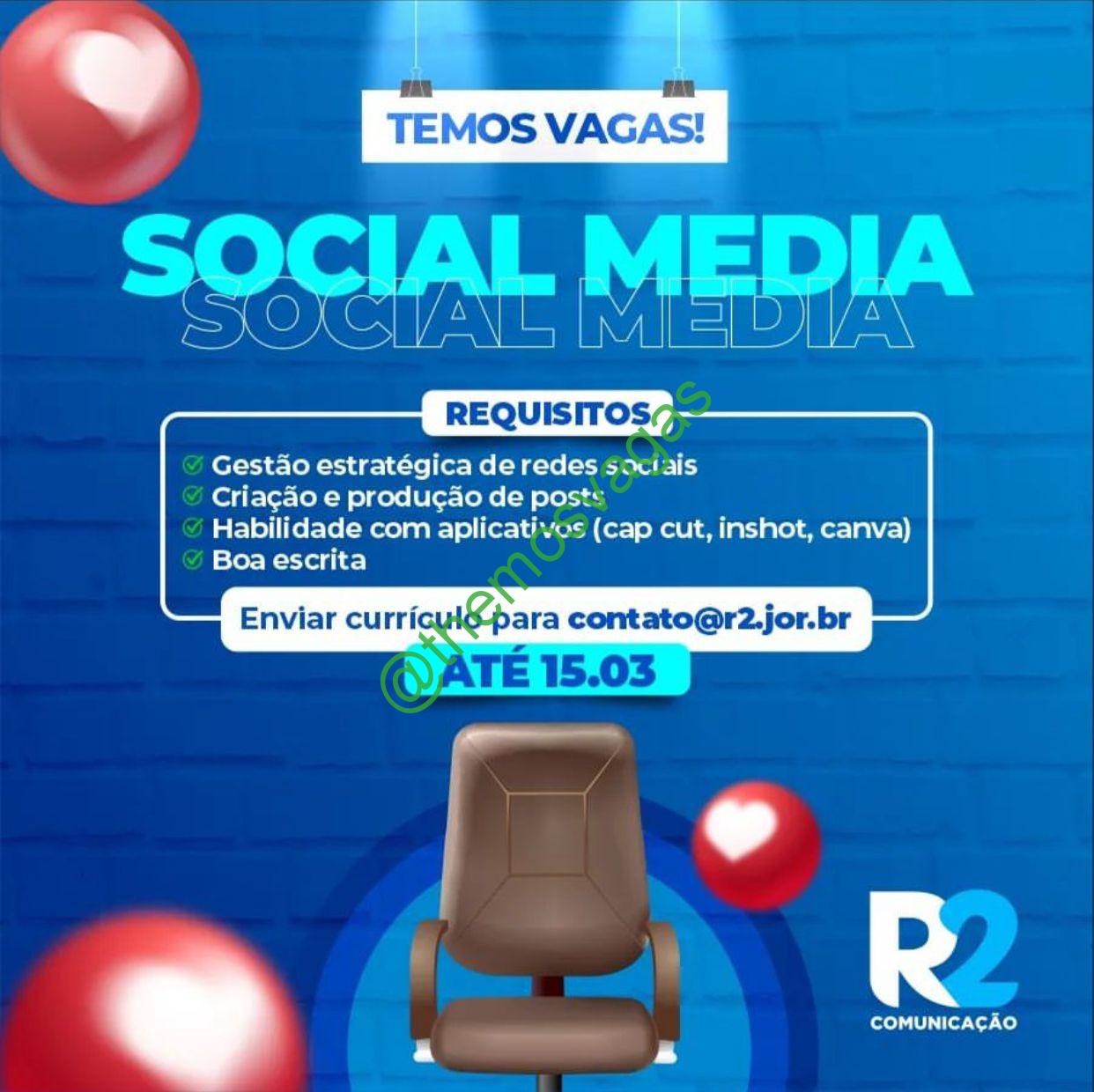 – Interessados(as) e que atendam ao perfil solicitado acima, devem enviar o currículo até 15/03/2023 para o e-mail contato@r2.jor.br contendo no título/assunto “Social Media – THE“.