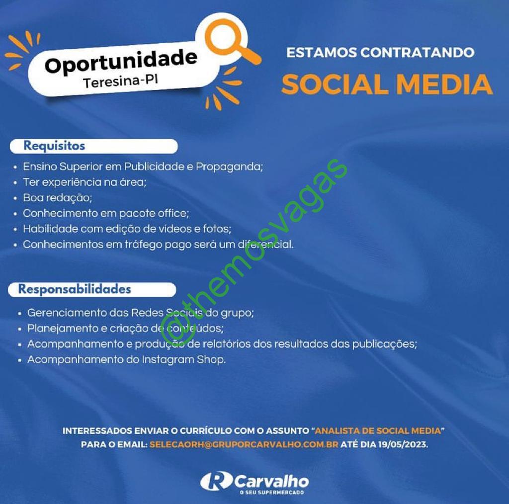 – Interessados(as) e que atendam ao perfil solicitado acima, devem enviar o currículo até 19/05/2023 para o e-mail selecaorh@grupocarvalho.com.br contendo no título/assunto “Analista de Social Media”.