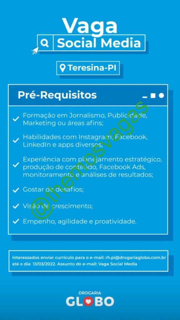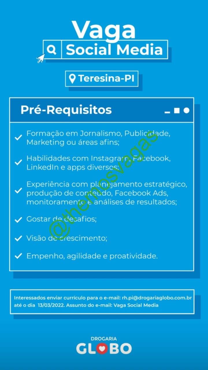 – Interessados(as) e que atendam ao perfil solicitado acima, devem enviar o currículo até 13/03/2022  para o e-mail rh.pi@drogariaglobo.com.br contendo no título/assunto “Vaga Social Media