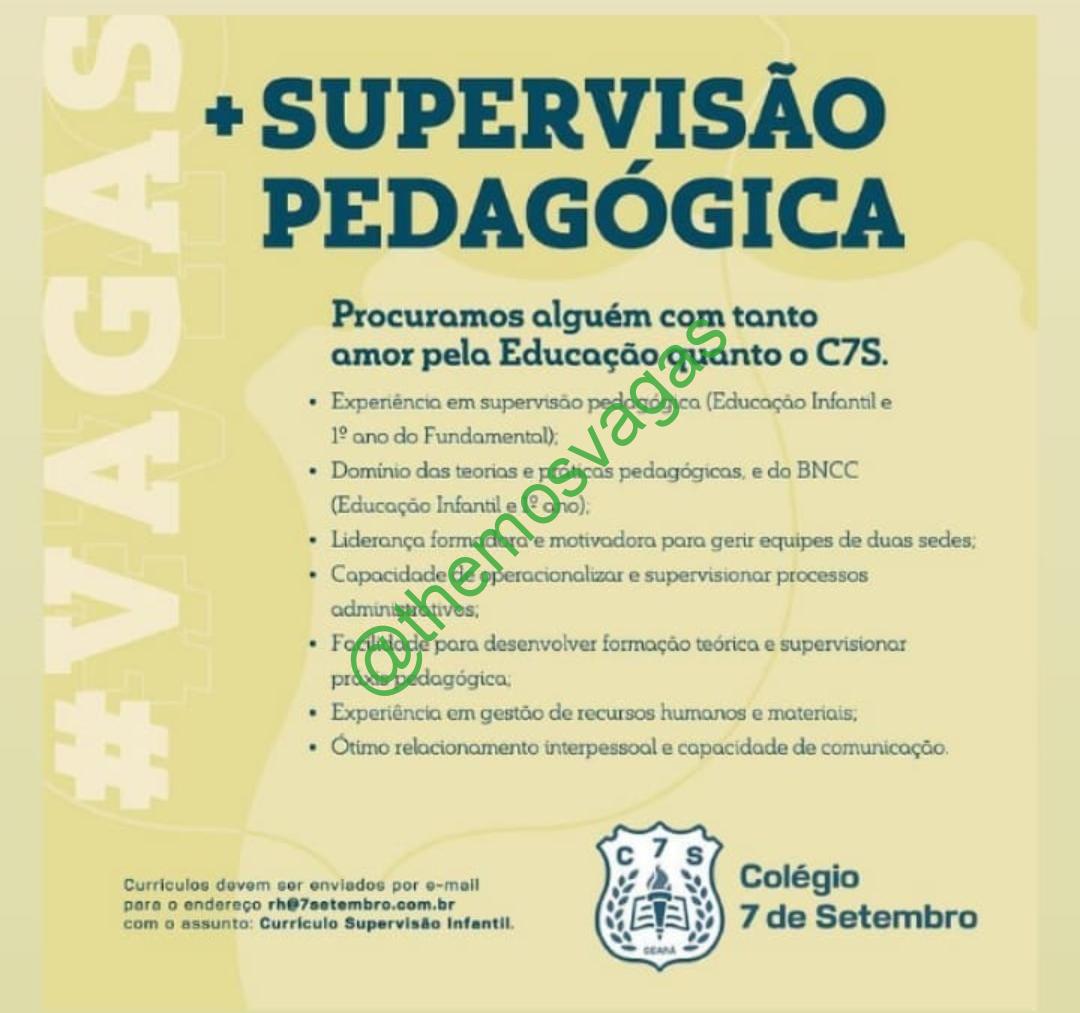 – Interessados(as) e que atendam ao perfil solicitado acima, devem enviar o currículo para o e-mail rh@7setembro.com.br, contendo no título/assunto “Supervisão Pedagógia – FOR”.