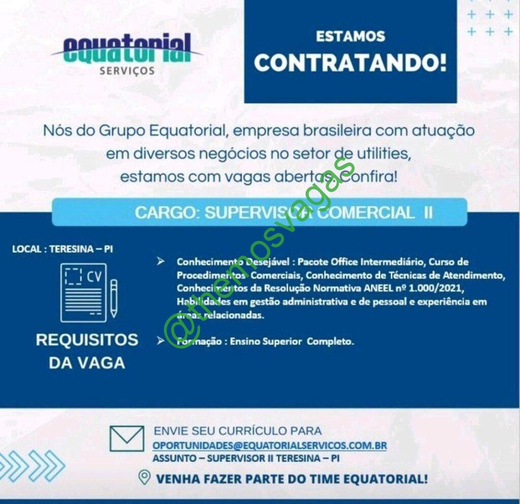 – Interessados(as) e que atendam ao perfil solicitado acima, devem enviar o currículo para o e-mail oportunidades@equatorialservicos.com.br contendo no título/assunto “Supervisor II Teresina – PI”.