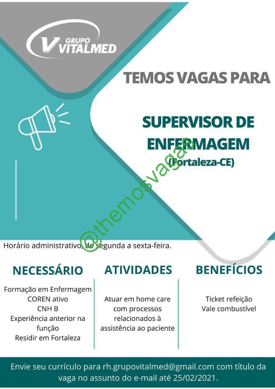 – Interessados(as) e que atendam ao perfil solicitado acima, devem enviar o currículo 25/02/2021 para o e-mail rh.grupovitalmed@gmail.com contendo no título/assunto “Supervisor de Enfermagem – FOR