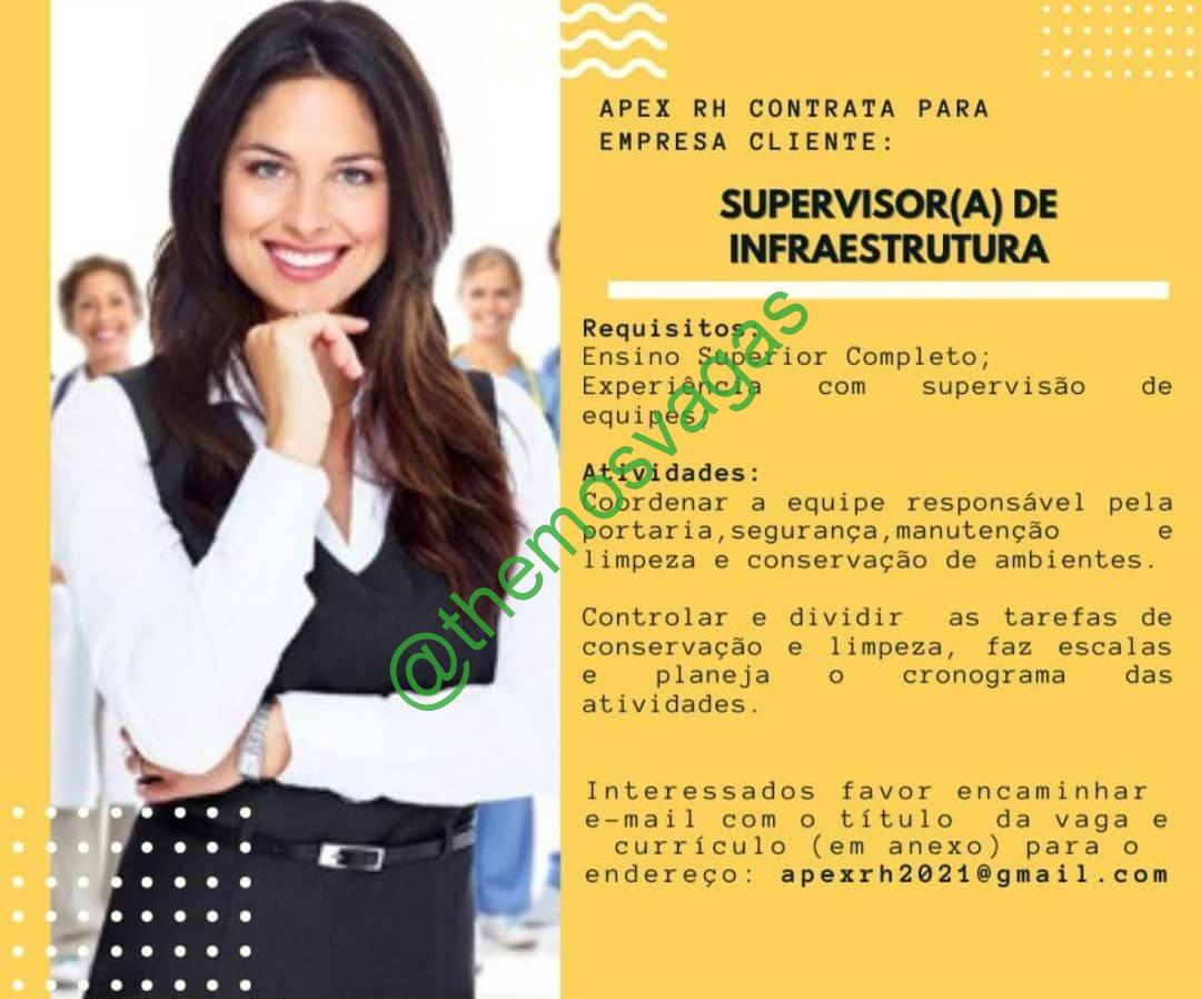 – Interessados(as) e que atendam ao perfil solicitado acima, devem enviar o currículo para o e-mail apexrh2021@gmail.com, contendo no titulo/assunto “Supervisor de Infraestrutura – FOR