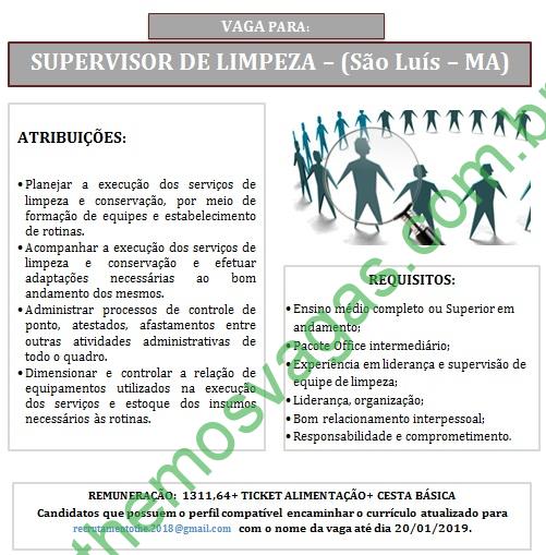 Interessados(as) e que atendam aos requisitos devem enviar o perfil profissional até o dia 20/01/2019, colocando no título do e-mail “Supervisor de Limpeza – São Luís”, para: recrutamentothe2018@gmail.com