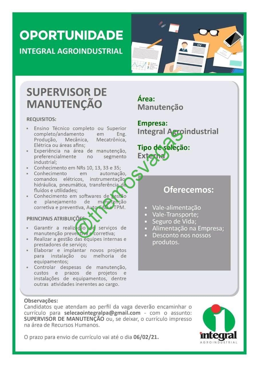 – Interessados(as) e que atendam ao perfil solicitado acima, devem enviar o currículo até 06/02 para o e-mail selecaointegralpa@gmail.com contendo no título/assunto “Supervisor de Manutenção – FOR