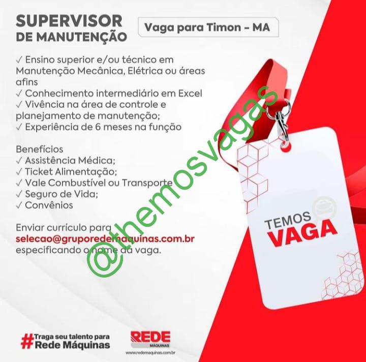 – Interessados(as) e que atendam ao perfil solicitado acima, devem enviar o currículo para o e-mail selecao@gruporedemaquina.com.br contendo no título/assunto “Supervisor de Manutenção – Timon
