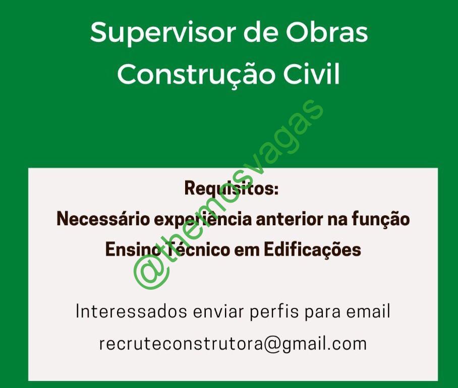 – Interessados(as) e que atendam ao perfil solicitado acima, devem enviar o currículo para o e-mail recruteconstrutora@gmail.com contendo no título/assunto “Supervisor de Obras THE