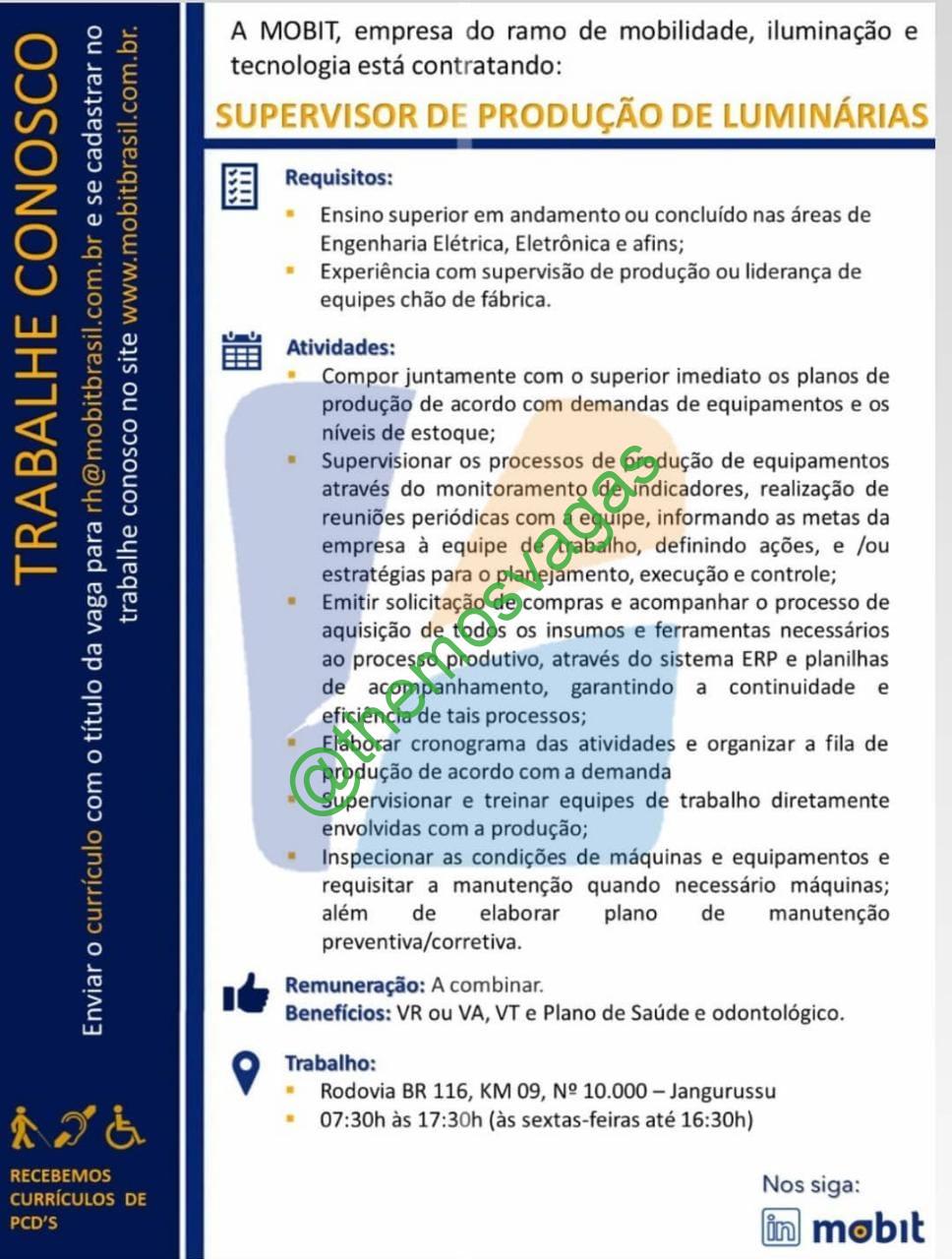 – Interessados(as) e que atendam ao perfil solicitado acima, devem enviar o currículo para o e-mail rh@mobitbrasil.com.br , contendo no título/assunto “Supervisor de Produção Luminárias – FOR“.