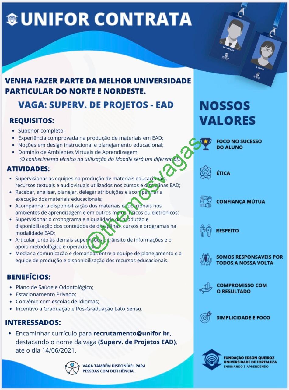 – Interessados(as) e que atendam ao perfil solicitado acima, devem enviar o currículo até 14|06|2021 para o e-mail recrutamento@unifor.br, contendo no titulo/assunto “Supervisor(a) de Projetos EAD – FOR