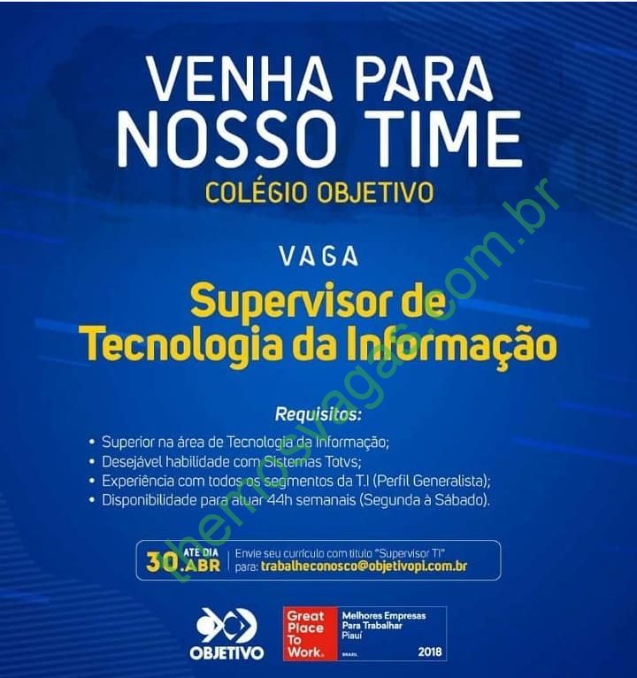 – Interessados(as) e que atendam ao perfil solicitado acima devem enviar o perfil profissional até 30/04/2019 para o e-mail trabalheconosco@objetivopi.com.br contendo no título “Supervisor de Tecnologia da Informação”.
