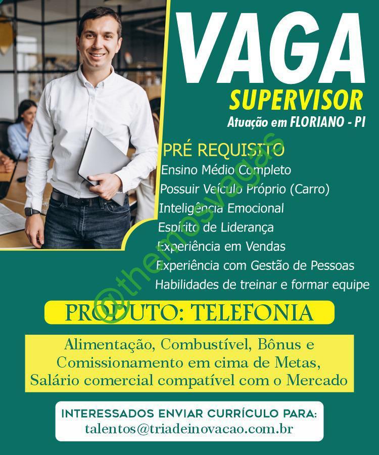 – Interessados(as) e que atendam ao perfil solicitado acima, devem enviar o currículo para o e-mail talentos@triadeinovacao.com.br contendo no título/assunto “Supervisor – Floriano