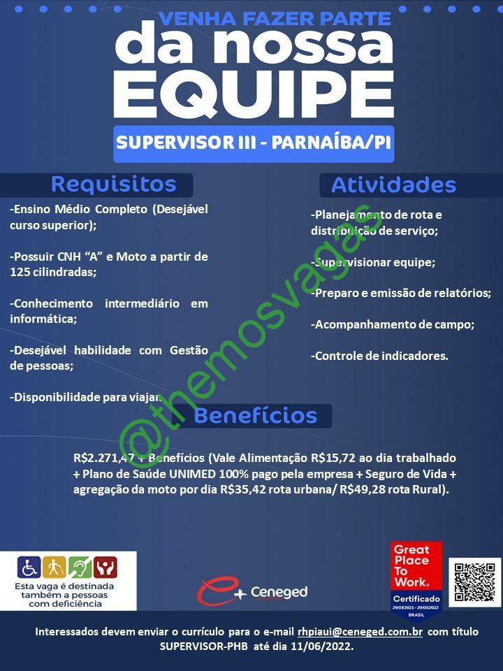 – Interessados(as) e que atendam ao perfil solicitado acima, devem enviar o currículo até 11/06/2022  para o e-mail rhpiaui@ceneged.com.br contendo no título/assunto “Supervisor -PHB