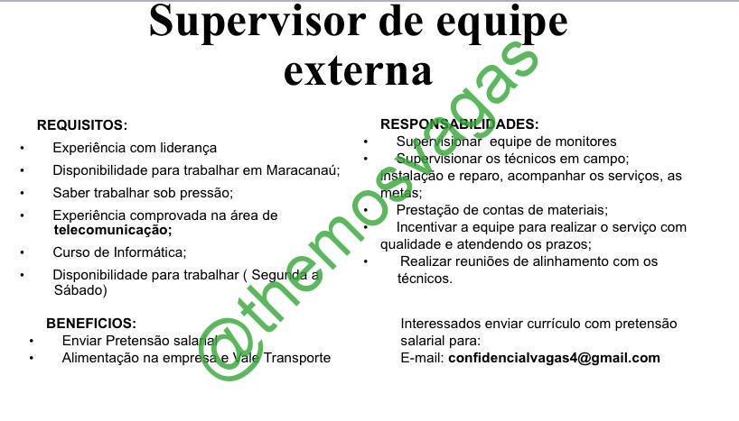 – Interessados(as) e que atendam ao perfil solicitado acima, devem enviar o currículo para o e-mail confidencialvagas4@gmail.com, contendo no titulo/assunto “Supervisor(a) de Equipe – FOR
