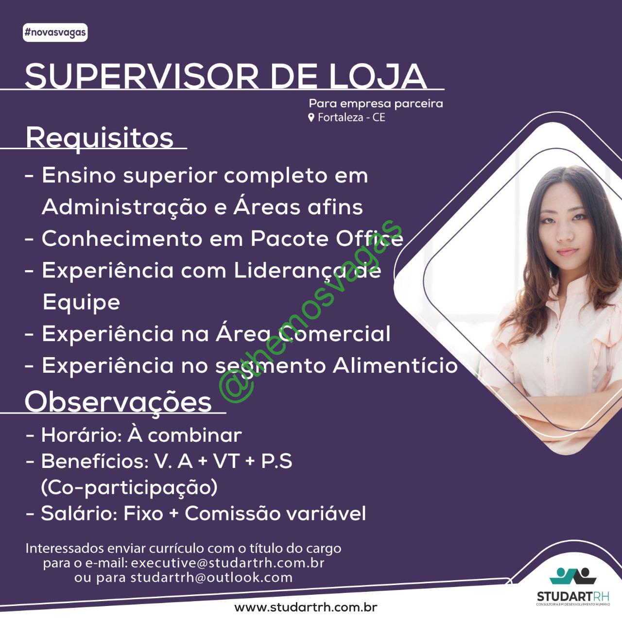 – Interessados(as) e que atendam ao perfil solicitado acima, devem enviar o currículo para o e-mail executive@studartrh.com.br, contendo no titulo/assunto “Supervisor(a) de Loja – FOR