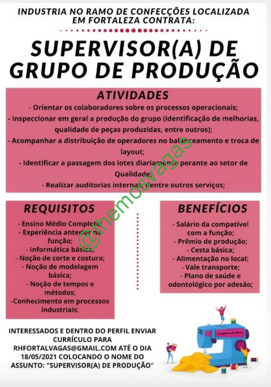 – Interessados(as) e que atendam ao perfil solicitado acima, devem enviar o currículo até 18|05|2021 para o e-mail rhfortalvagas@gmail.com contendo no título/assunto “Supervisor(a) de Produção – FOR“.
