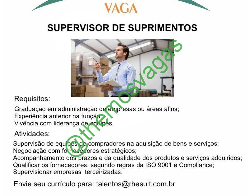 – Interessados(as) e que atendam ao perfil solicitado acima, devem enviar o currículo para o e-mail talentos@rhesult.com.br, contendo no titulo/assunto “Supervisor(a) de Suprimentos – FOR”