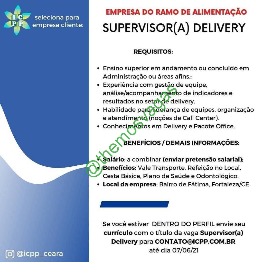 – Interessados(as) e que atendam ao perfil solicitado acima, devem enviar o currículo até 07|06|2021 para o e-mail contato@icpp.com.br, contendo no titulo/assunto “Supervisor(a) Delivery – FOR