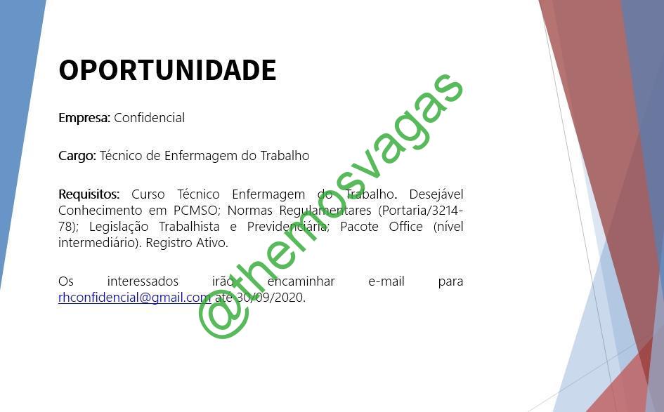 – Interessados(as) e que atendam ao perfil solicitado acima, devem enviar o currículo até 30/09/2020 para o e-mail rhconfidencial@gmail.com contendo no título/assunto “Tec de Enfermagem do Trabalho THE