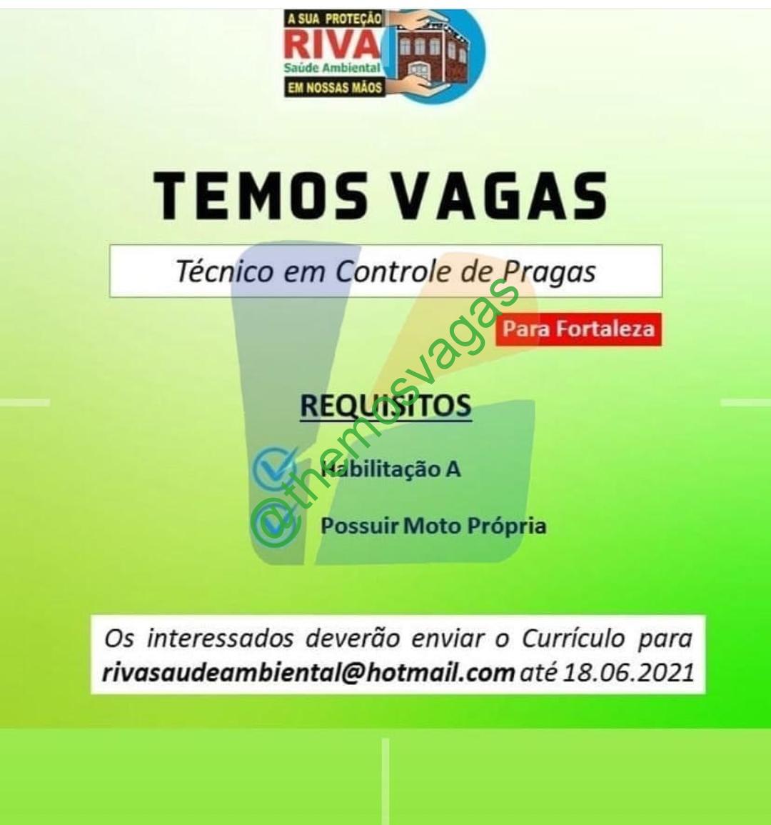 – Interessados(as) e que atendam ao perfil solicitado acima, devem enviar o currículo até 18/06/2021 para o e-mail rivasaudeambiental@hotmail.com, contendo no titulo/assunto “Téc em Controle de Pragas – FOR”.