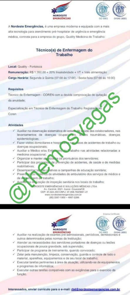 – Interessados(as) e que atendam ao perfil solicitado acima, devem enviar o currículo para o e-mail rh4@nordesteemergencias.com.br contendo no título/assunto “Téc em Enf do Trabalho – FOR