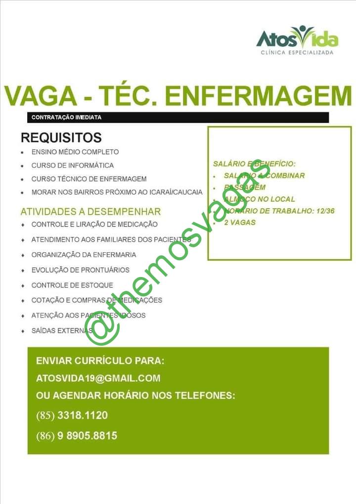 – Interessados(as) e que atendam ao perfil solicitado acima, devem enviar o currículo para o e-mail atosvida19@gmail.com contendo no título/assunto “Técnico em Enfermagem – FOR