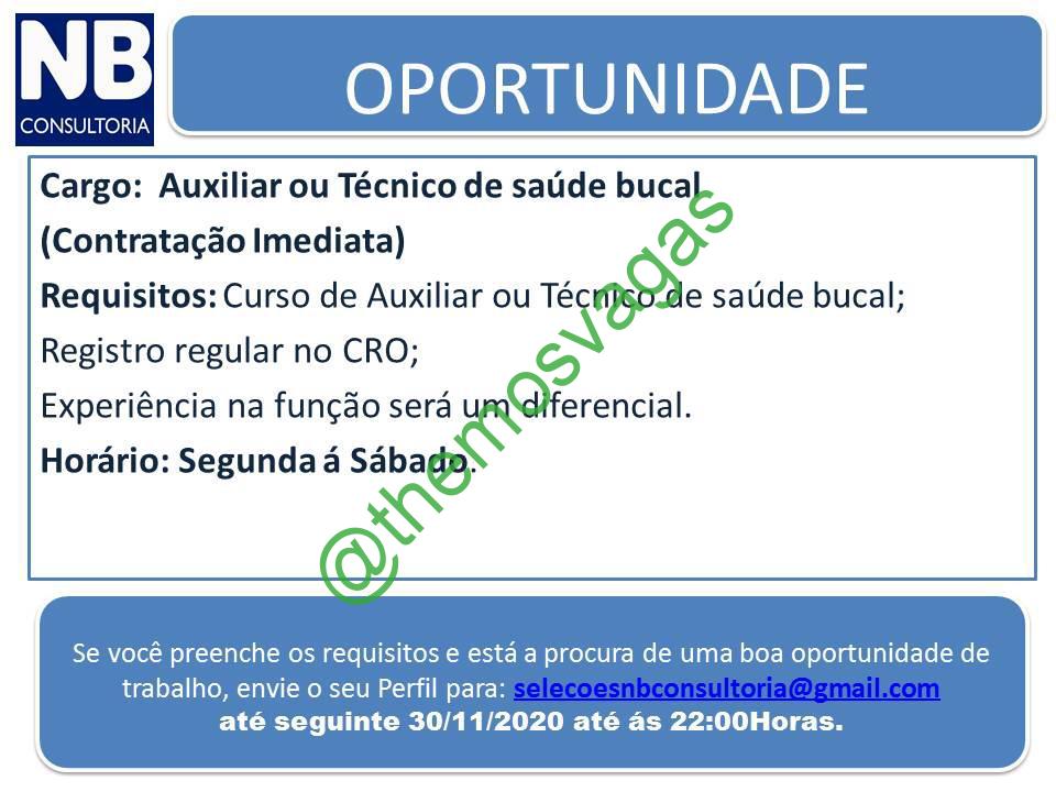 – Interessados(as) e que atendam ao perfil solicitado acima, devem enviar o currículo com foto até 30/11/2020 para o e-mail selecoesnbconsultoria@gmail.com contendo no título/assunto “Tec em Saúde Bucal THE