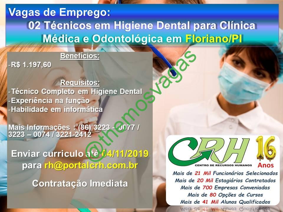 – Interessados(as) e que atendam ao perfil solicitado acima, devem enviar o currículo até 04/11/2019 para o e-mail rh@portalcrh.com.br contendo no título/assunto “Técnico de Higiene Dental Floriano“.