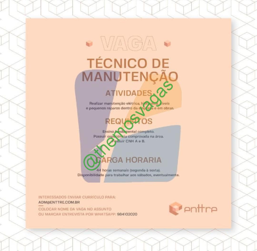 – Interessados(as) e que atendam ao perfil solicitado acima, devem enviar o currículo para o e-mail adm@enttre.com.br, contendo no título/assunto “Técnico de Manutenção – FOR“.