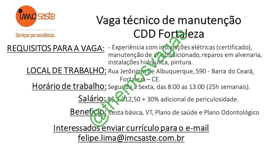 – Interessados(as) e que atendam ao perfil solicitado acima, devem enviar o currículo para o e-mail felipe.lima@imcsaste.com.br, contendo no título/assunto “Técnico de Manutenção – FOR“.