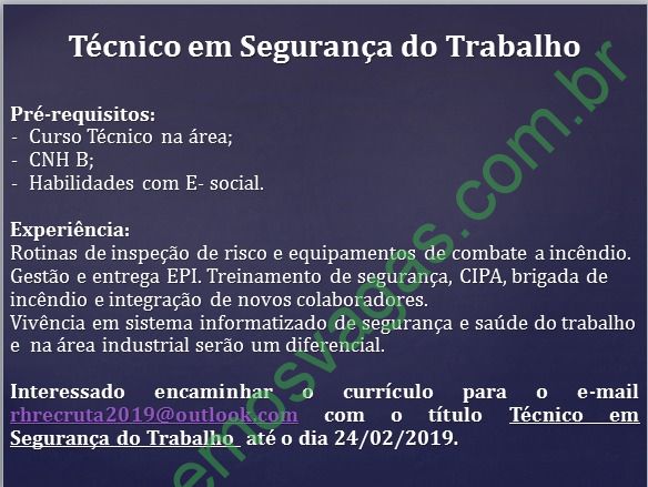Interessados(as) e que atendam aos requisitos devem enviar o perfil profissional até o dia 24/02/2019, colocando no título do e-mail “Técnico de Segurança do Trabalho “, para: rhrecruta2019@outlook.com