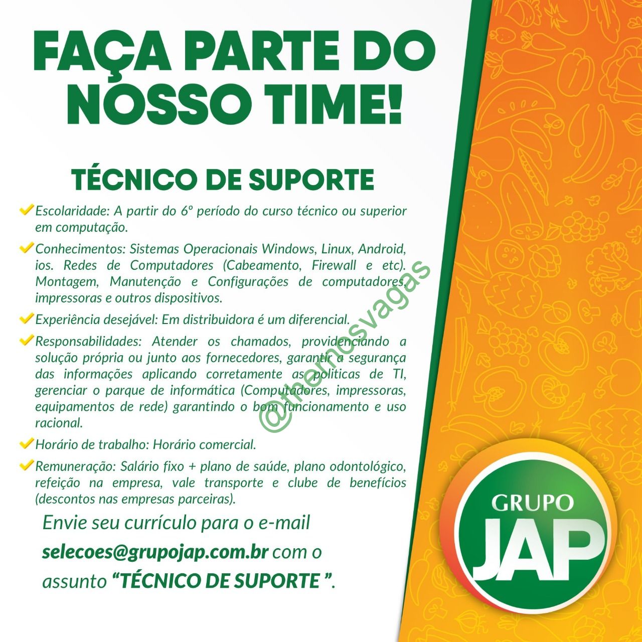 – Interessados(as) e que atendam aos requisitos devem enviar o perfil profissional, colocando no título do e-mail “Técnico de Suporte”, para: selecoes@grupojap.com.br