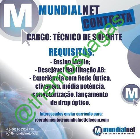 – Interessados(as) e que atendam ao perfil solicitado acima, devem enviar o currículo para o e-mail recrutamento@mundialnettelecom.com contendo no título/assunto “Técnico de Suporte THE