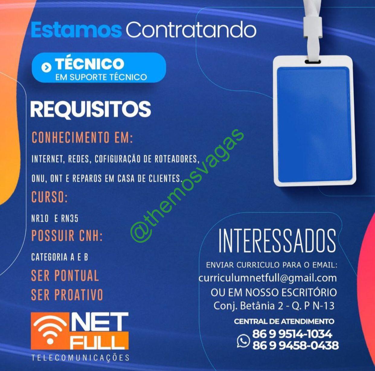 – Interessados(as) e que atendam ao perfil solicitado acima, devem enviar o currículo  para o e-mail curriculumnetfull@gmail.com contendo no título/assunto “Técnico de Suporte – PHB” ou entregar no seguinte endereço: Conjunto Betânia 2 – Q P N-13, Parnaíba/PI.