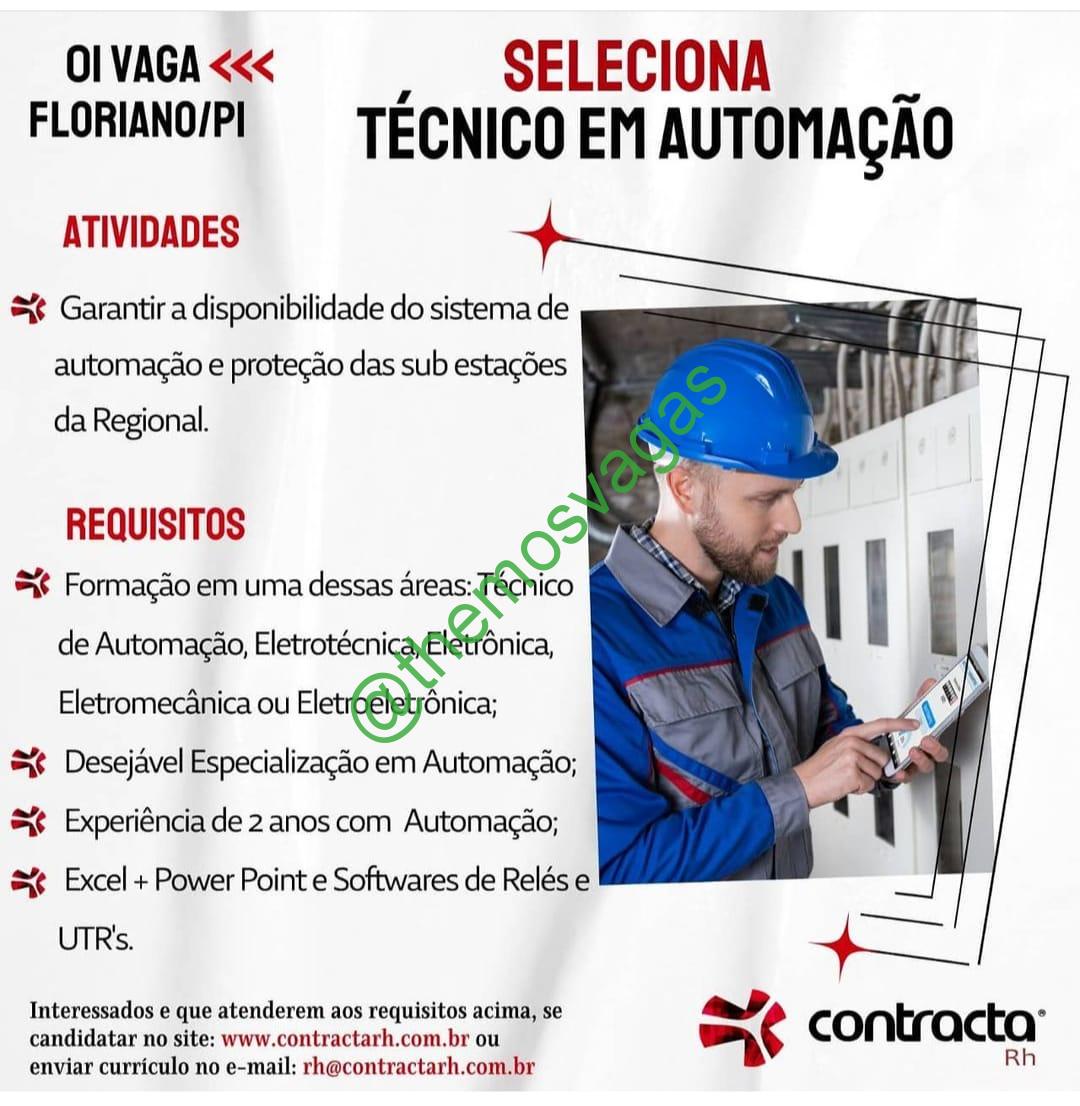 – Interessados(as) e que atendam ao perfil solicitado acima, devem enviar o currículo para o e-mail rh@contractarh.com.br, contendo no título/assunto “Técnico em Automação – Floriano“.