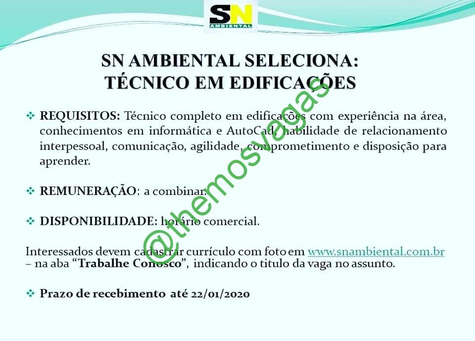 ---------- ATENÇÃO: Essa vaga é de responsabilidade do anunciante. Fique atento para possíveis golpes. Se perceber algo suspeito, nos comunique através do e-mail floromauel@gmail.com colocando no título "Themos Vagas - Denúncia" juntamente com o link da publicação e o motivo da denúncia na descrição da mensagem para que possamos analisar e parar de divulgar o anúncio. ----------