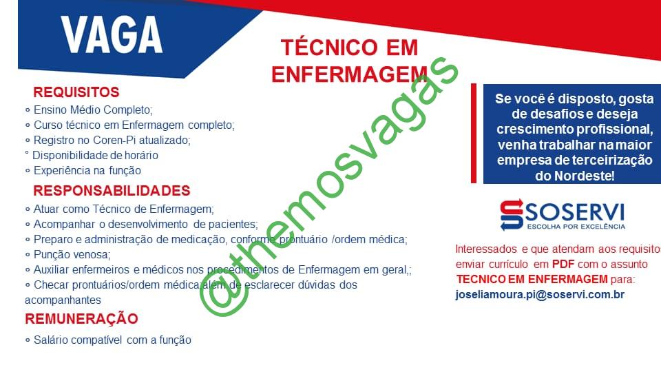 – Interessados(as) e que atendam ao perfil solicitado acima, devem enviar o currículo em PDF para o e-mail joseliamoura.pi@soservi.com.br , colocando no título/assunto: “Técnico em Enfermagem”.