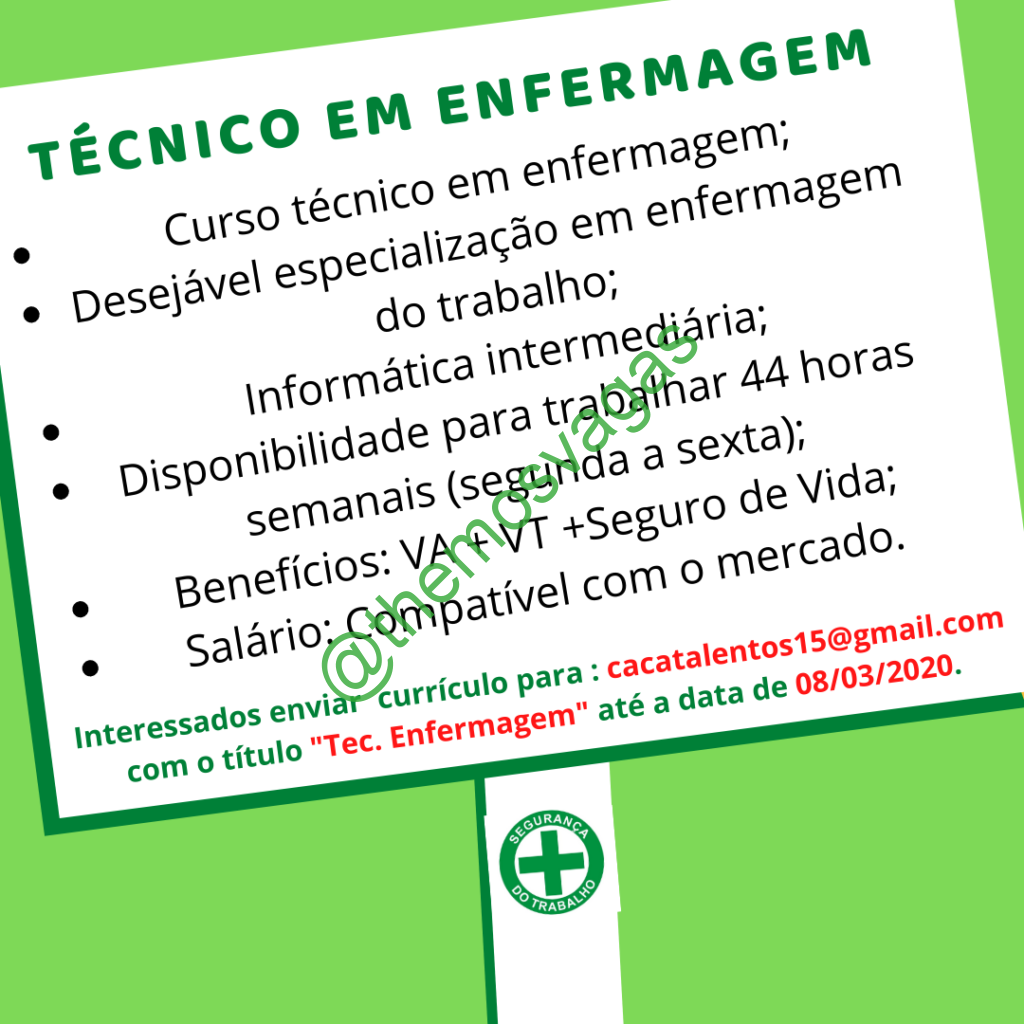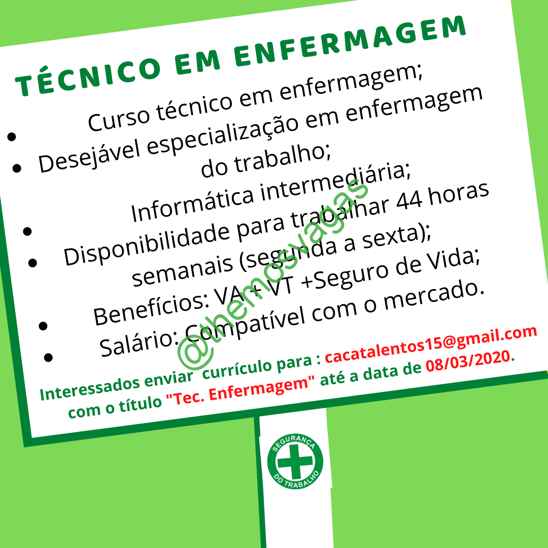 – Interessados(as) e que atendam ao perfil solicitado acima, devem enviar o currículo até 08/03/2020 para o e-mail cacatalentos15@gmail.com contendo no título/assunto “Tec. Enfermagem