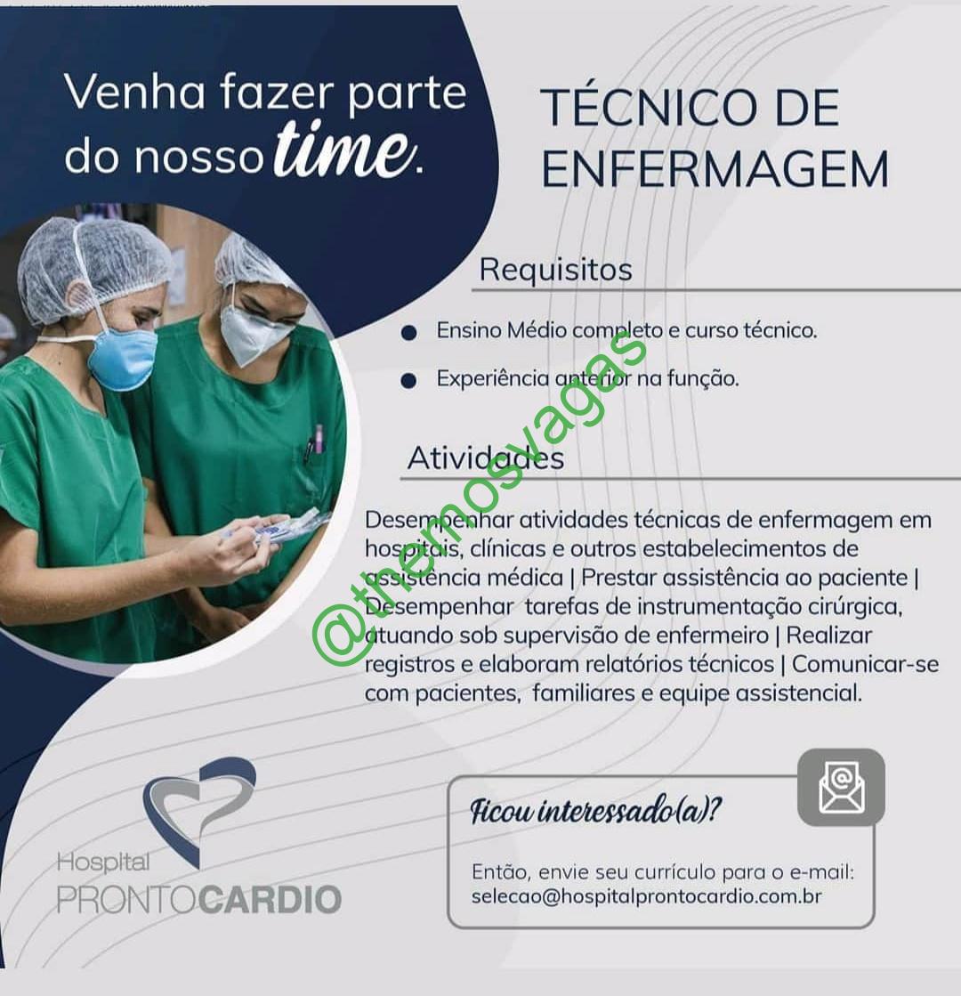 – Interessados(as) e que atendam ao perfil solicitado acima, devem enviar o currículo para o e-mail selecao@hospitalprontocardio.com.br, contendo no título/assunto “Técnico em Enfermagem – FOR”.