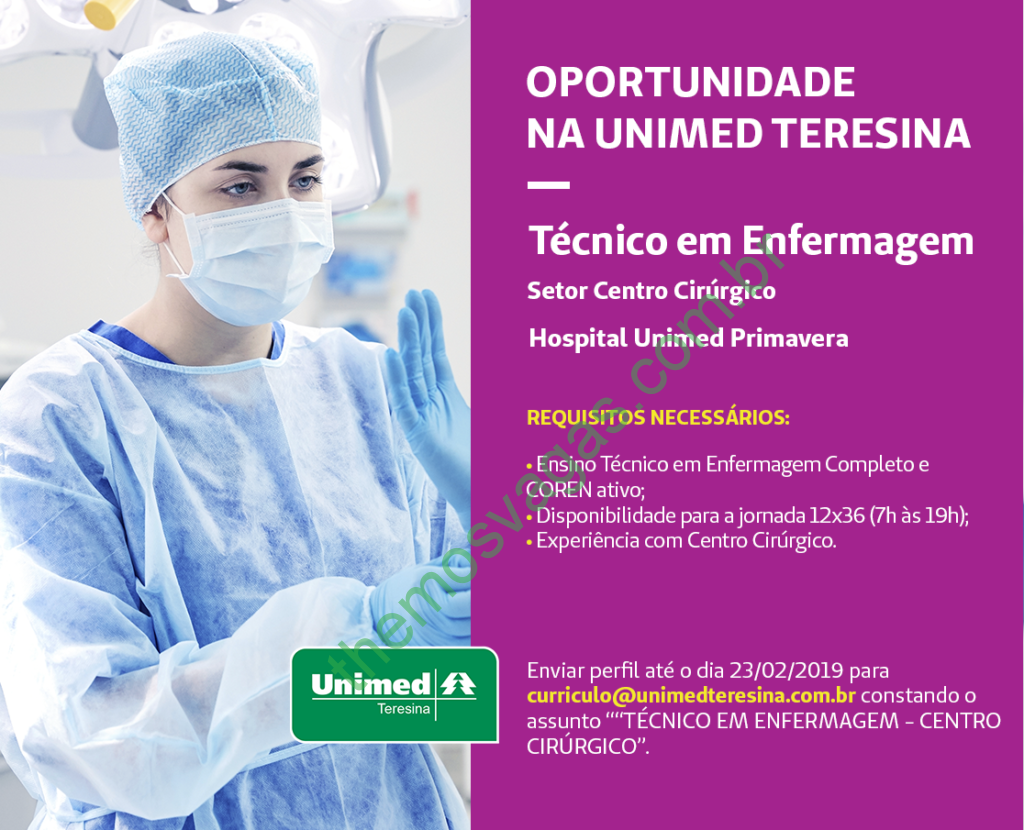 Interessados(as) e que atendam aos requisitos exigidos na imagem acima devem enviar o perfil profissional até 23/02/2019, contendo no título/assunto do e-mail “Técnico em Enfermagem – Centro Cirúrgico”, para curriculo@unimedteresina.com.br .
