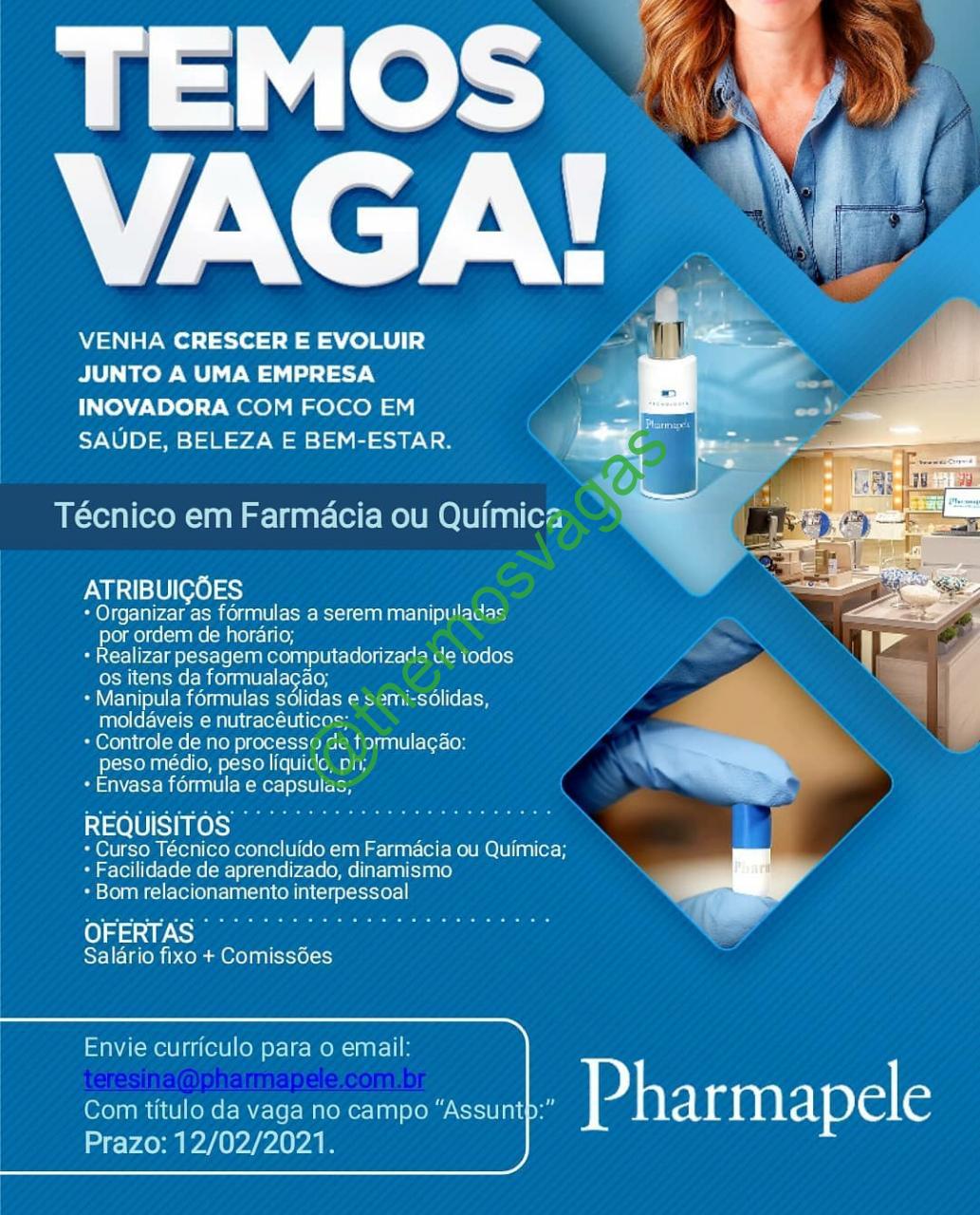 – Interessados(as) e que atendam ao perfil solicitado acima, devem enviar o currículo até 12/02/2021 para o e-mail teresina@pharmapele.com.br contendo no título/assunto “Técnico em Farmácia / Química – Teresina