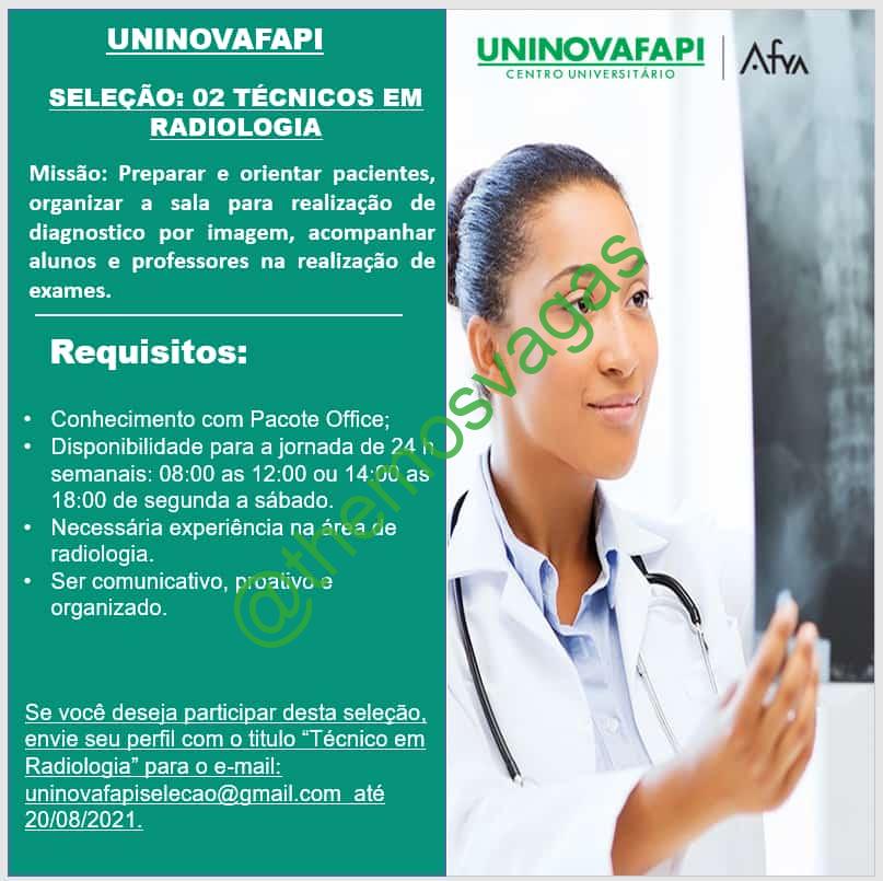 – Interessados(as) e que atendam ao perfil solicitado acima, devem enviar o currículo até 20/08/2021 para o para o e-mail uninovafapiselecao@gmail.com, contendo no título/assunto “Técnico em Radiologia“.