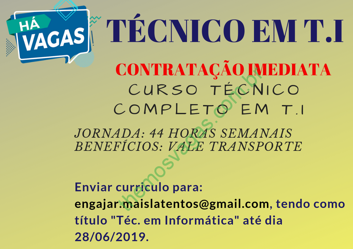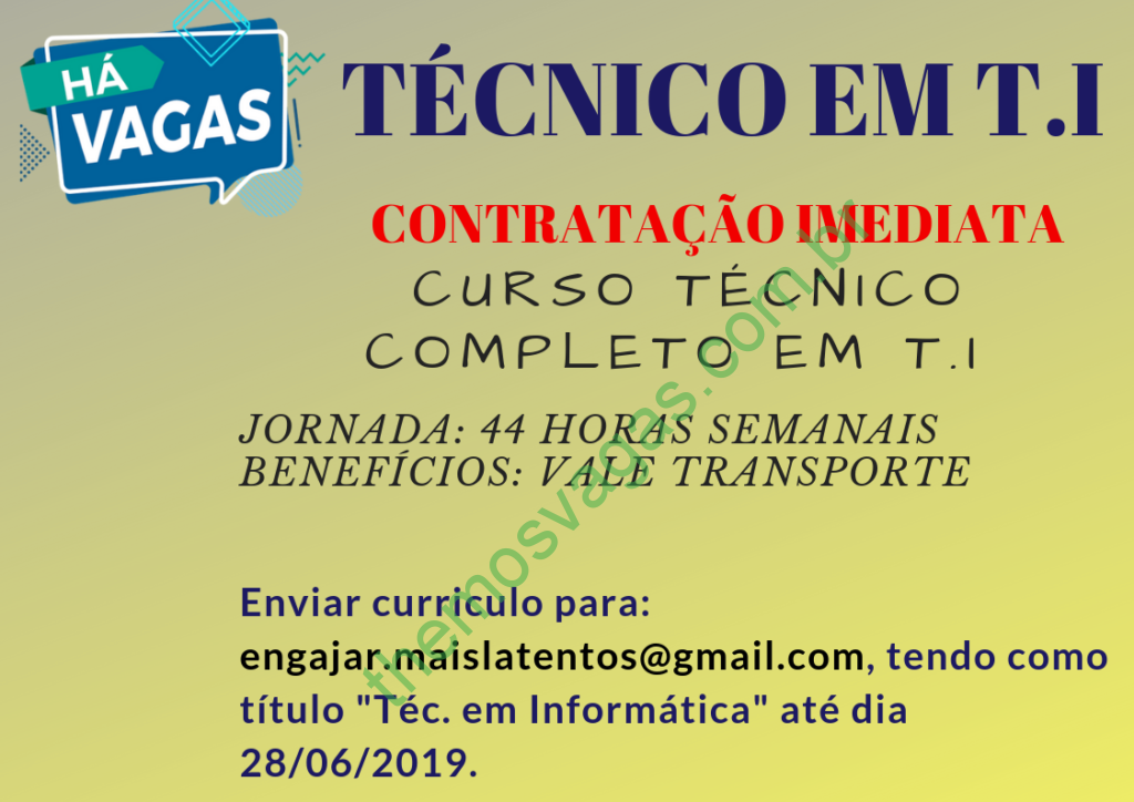 – Interessados(as) e que atendam aos requisitos devem enviar o perfil profissional até o dia 28/06/2019, colocando no título do e-mail “Téc em Informática”, para:  engajar.maistalentos@gmail.com