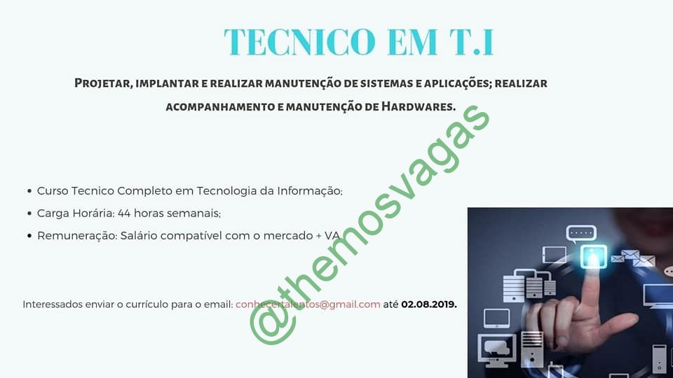 – Interessados(as) e que atendam ao perfil solicitado acima, devem enviar o currículo até 02/08/2019 para o e-mail conhecertalentos@gmail.com contendo no título/assunto “Técnico em TI THE”.
